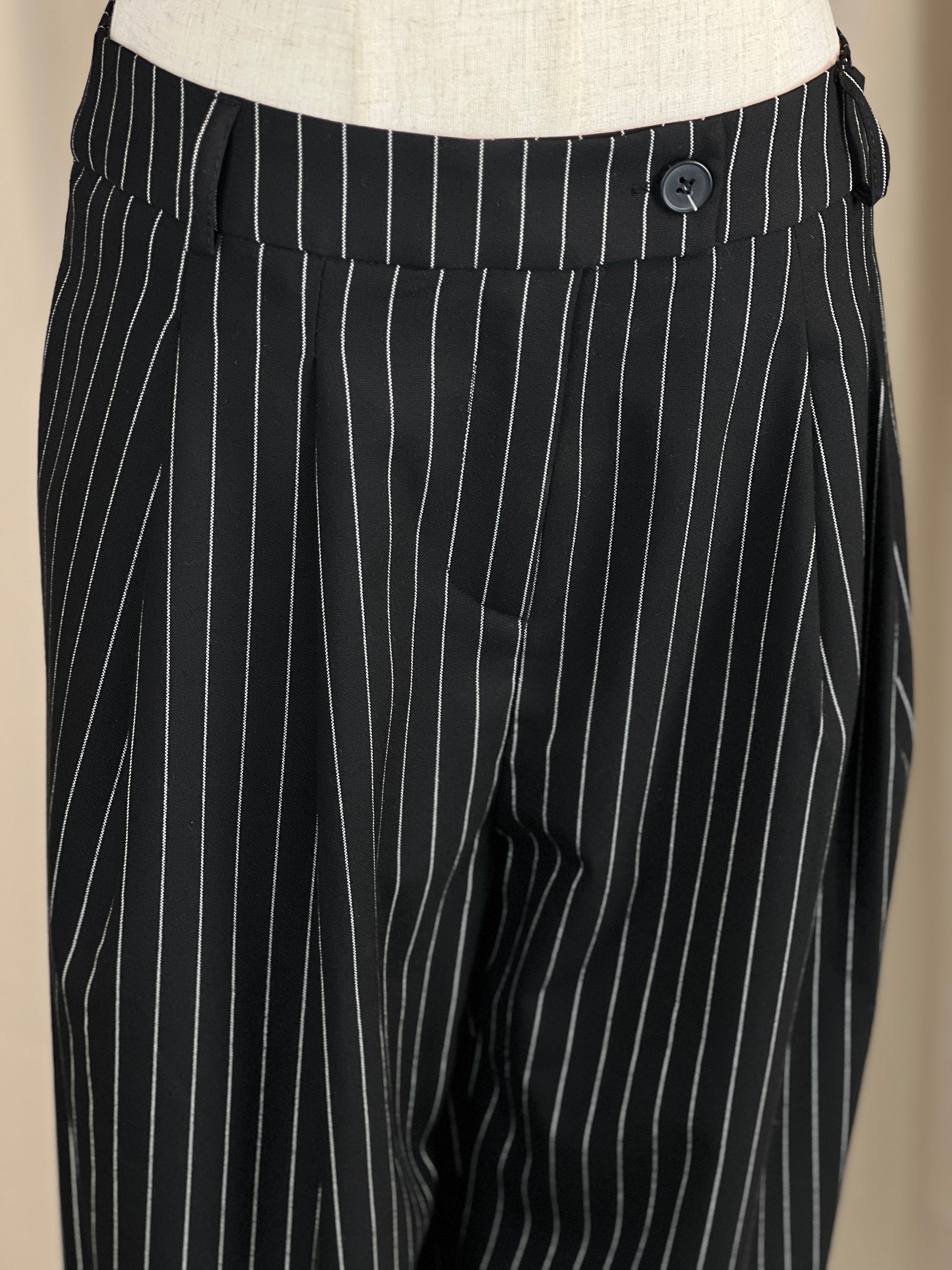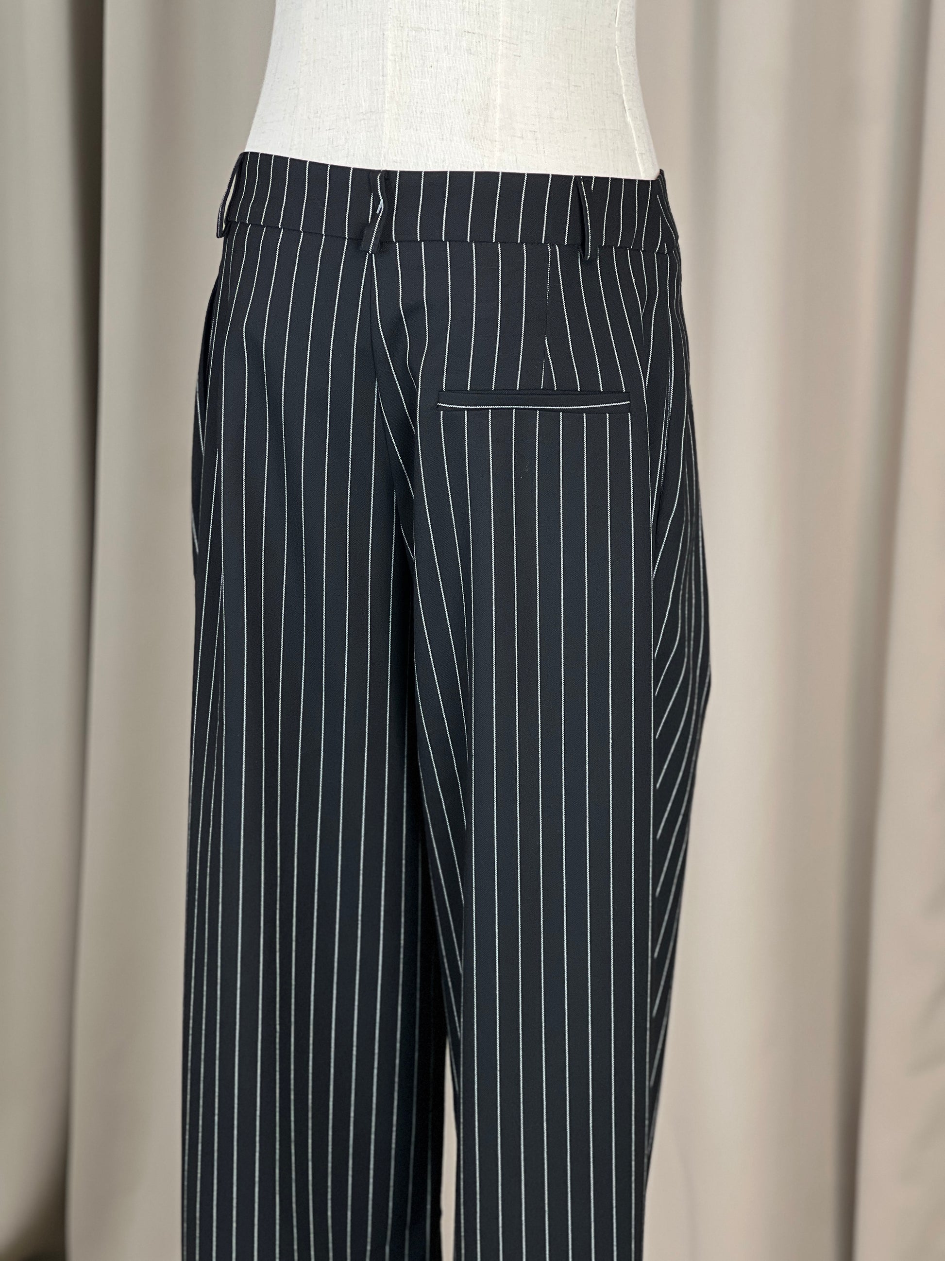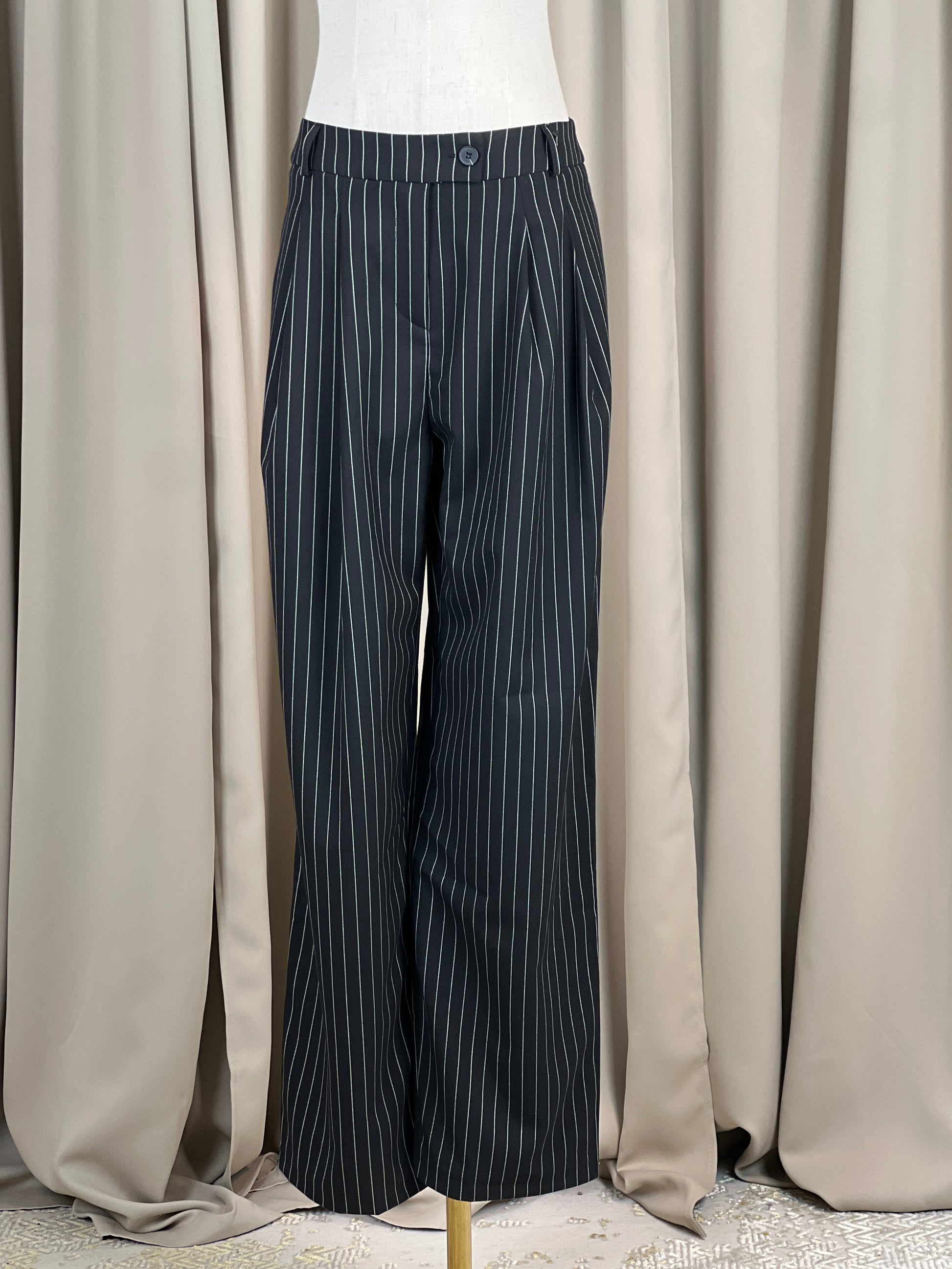 Елегантен панталон със средно висока талия, изработен от материя на фино райе, която придава стил и изтънченост. Свободната кройка осигурява комфорт и лекота при движение, а практичните джобчета допълват функционалността. Идеален избор както за ежедневието, така и за по-елегантни визии.