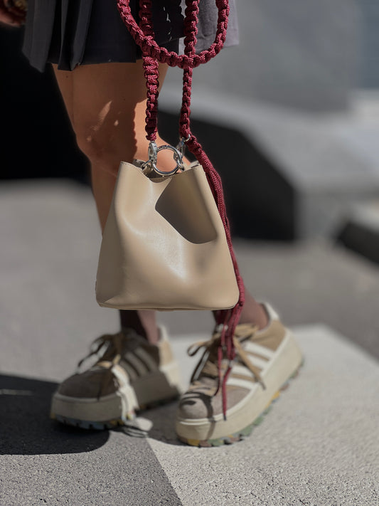 Чанта с ръчно плетена дръжка THE BUCKET / BEIGE AND BURGUNDY
