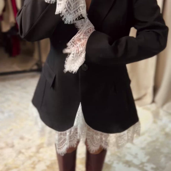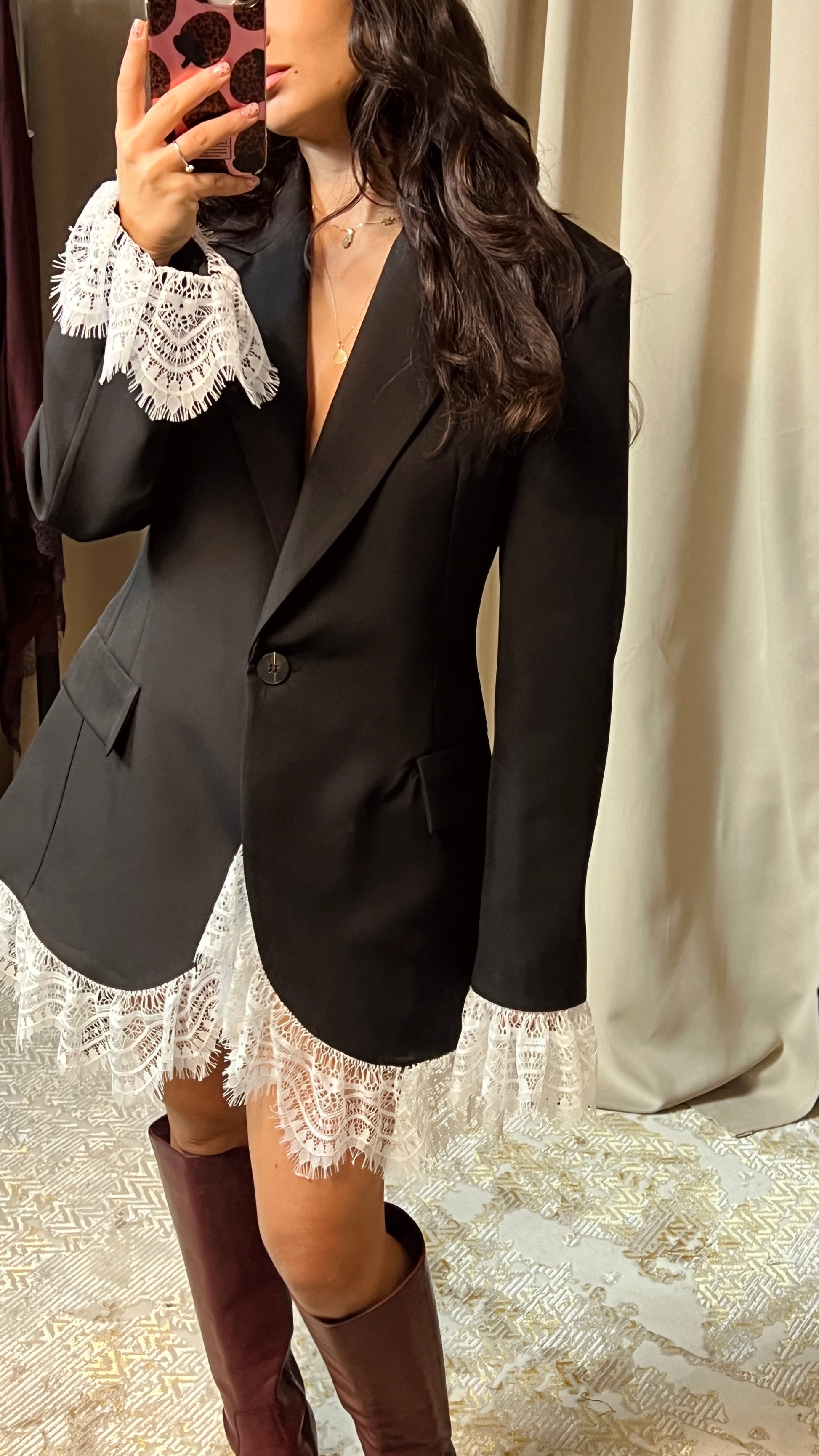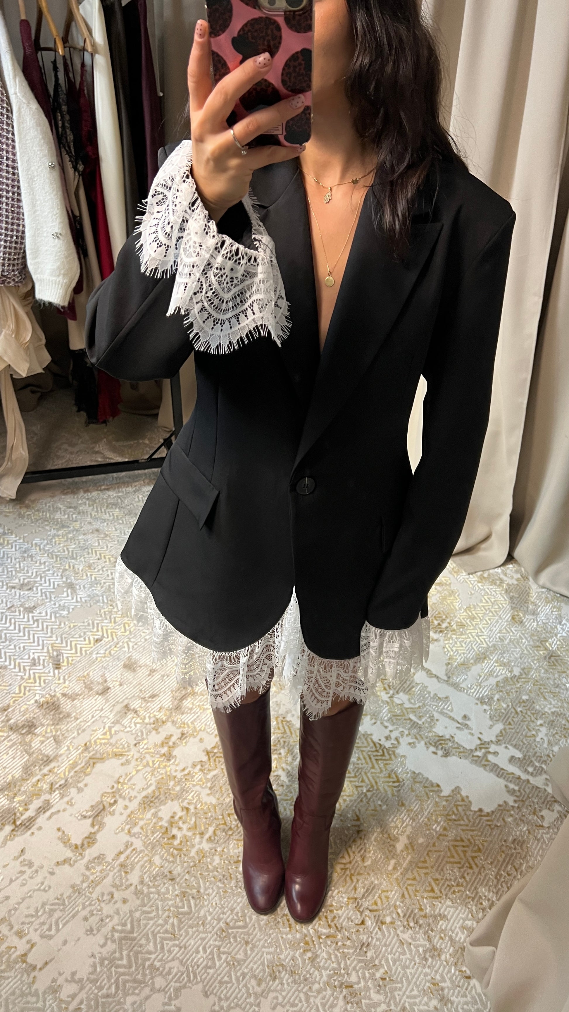 Това бижу може да е твое! Страхотен блейзър с удължена кройка, който може да се носи и като рокля. С красива дантела, която го прави повече от романтичен.