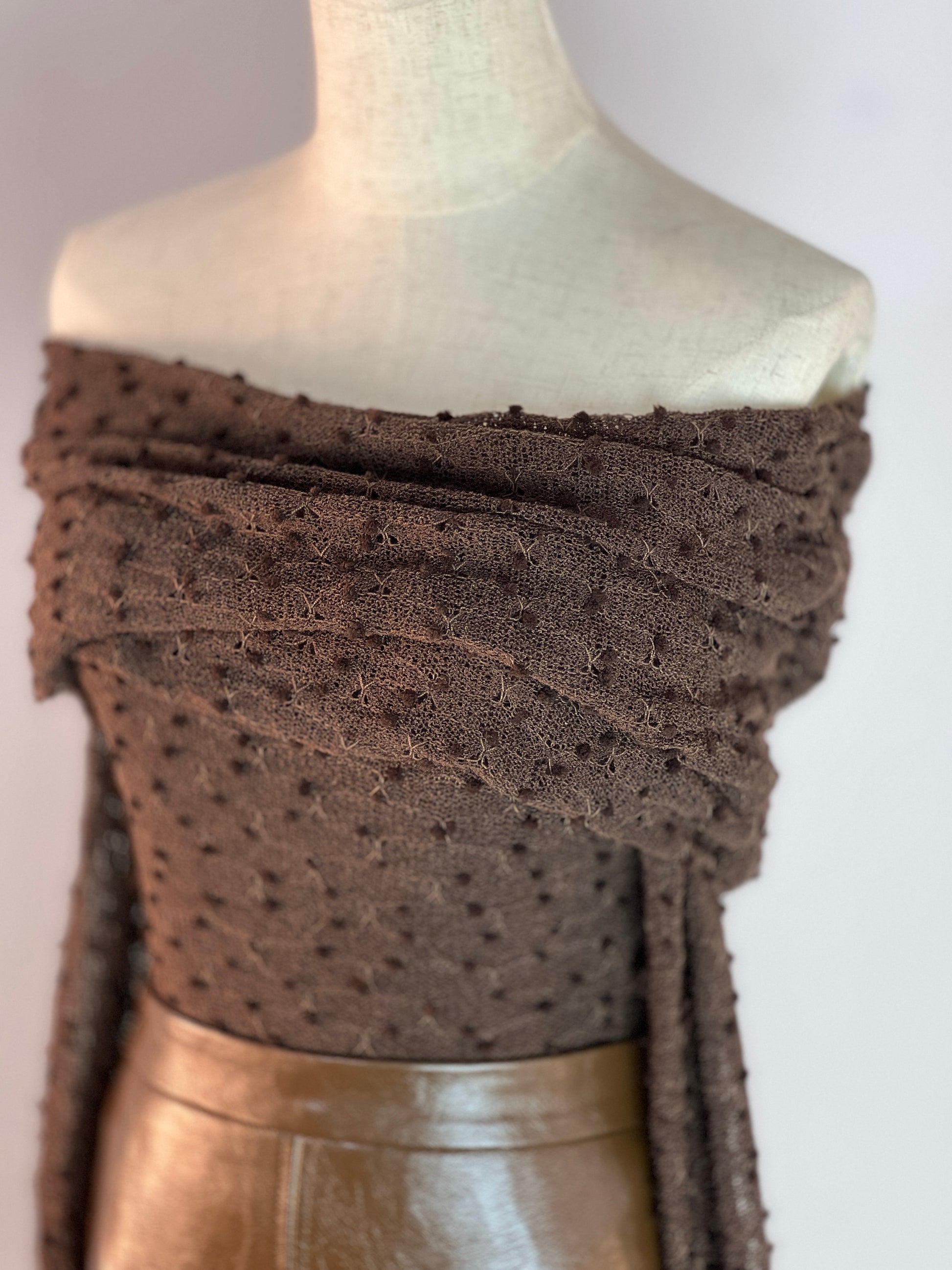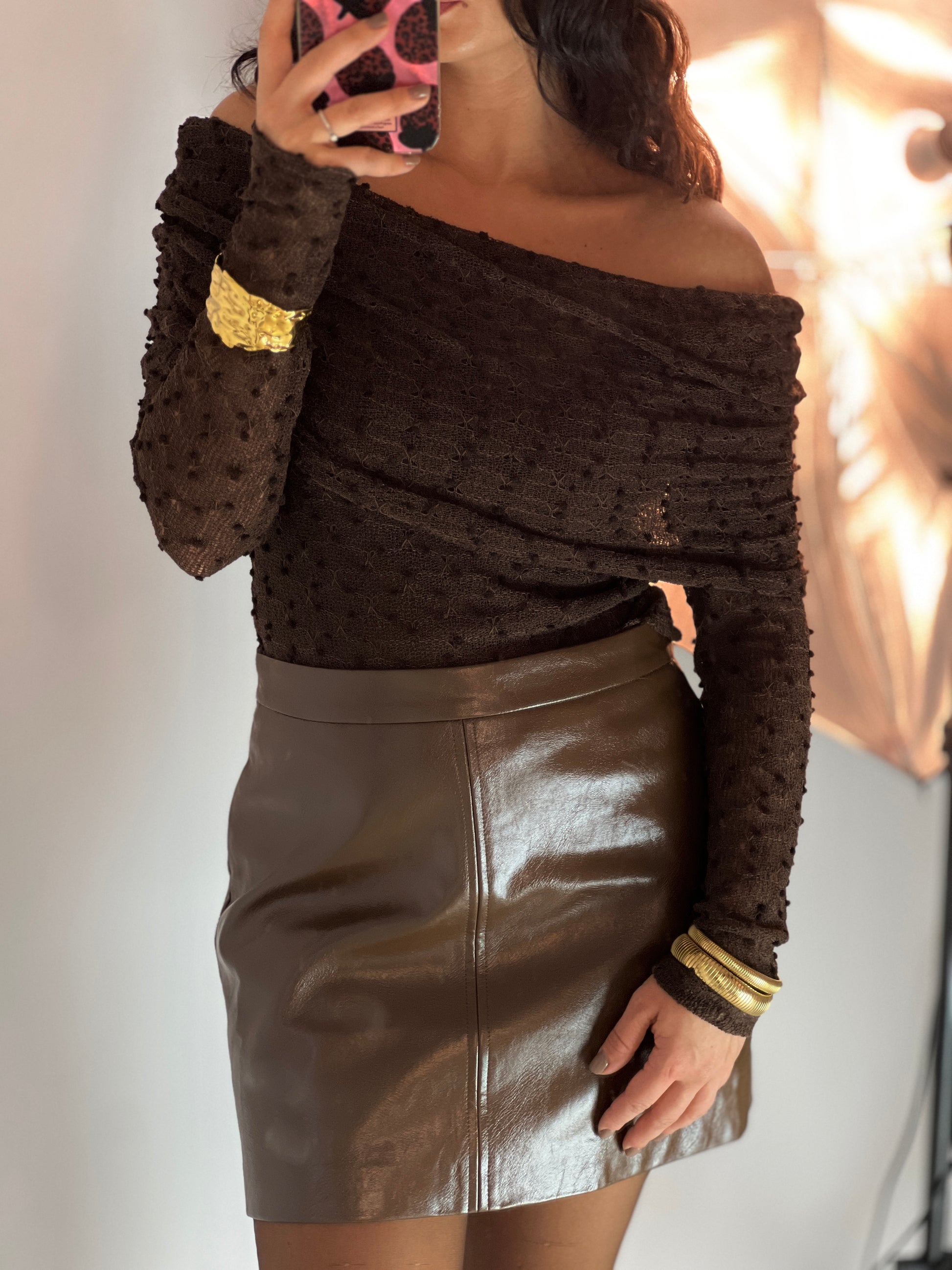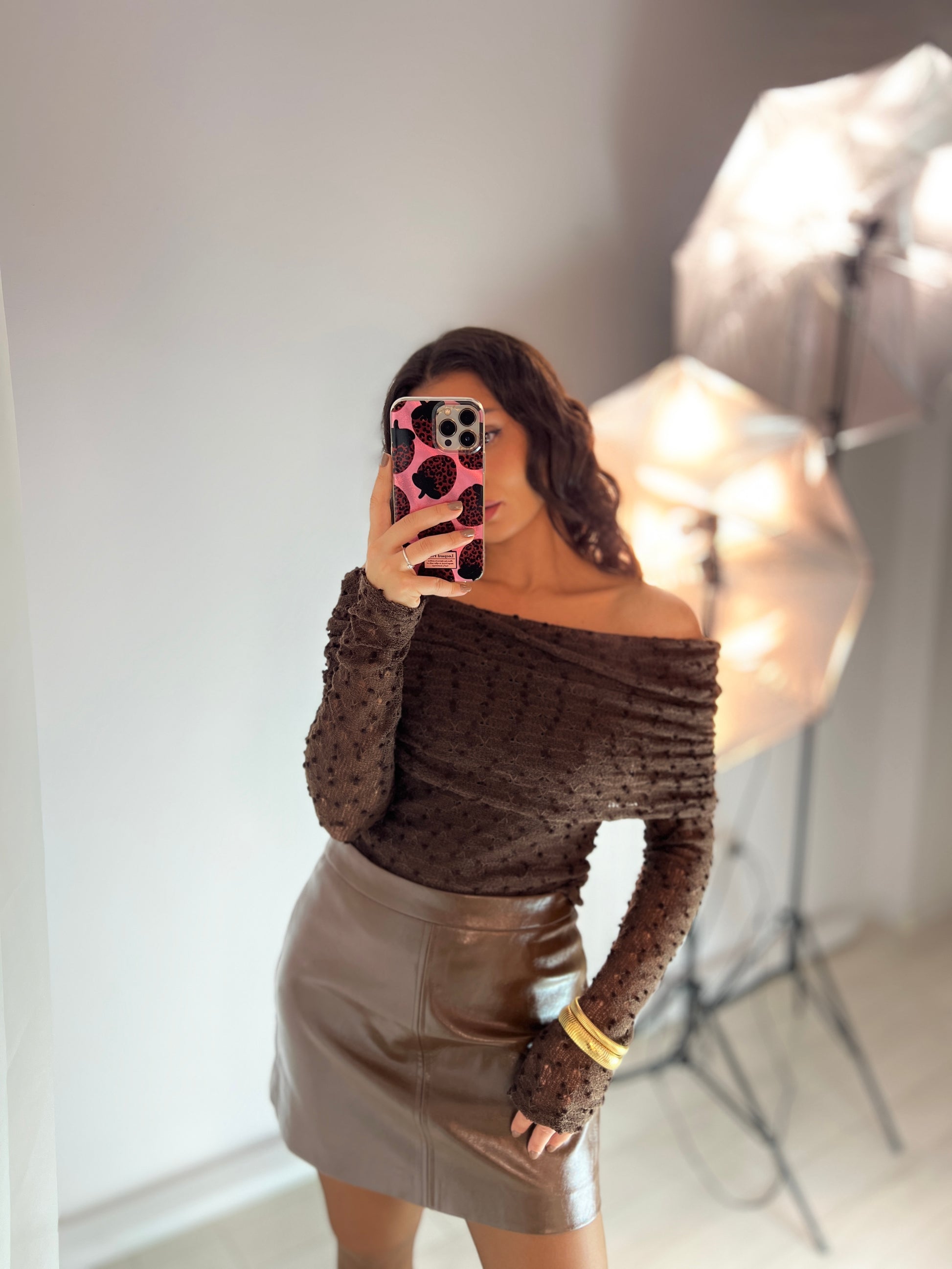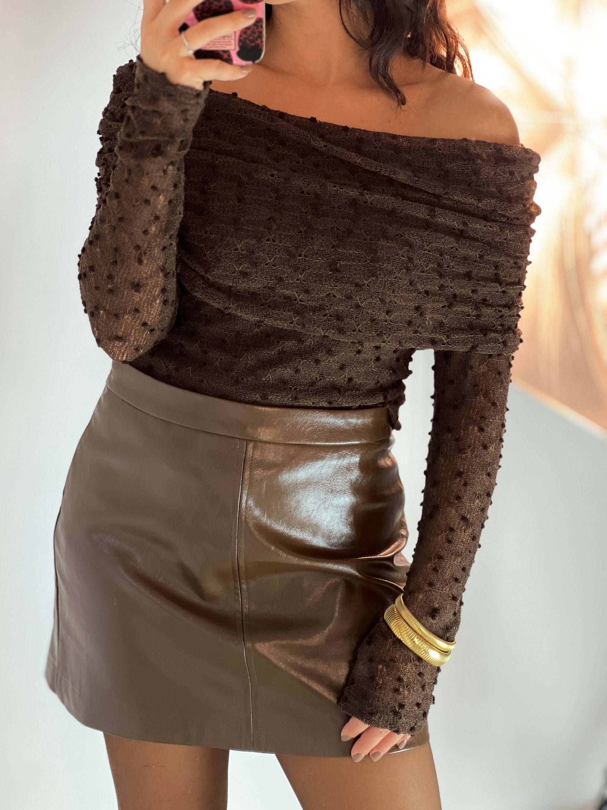Страхотна блуза с паднало рамо, с 3D ефект в актуален, топъл кафяв цвят.