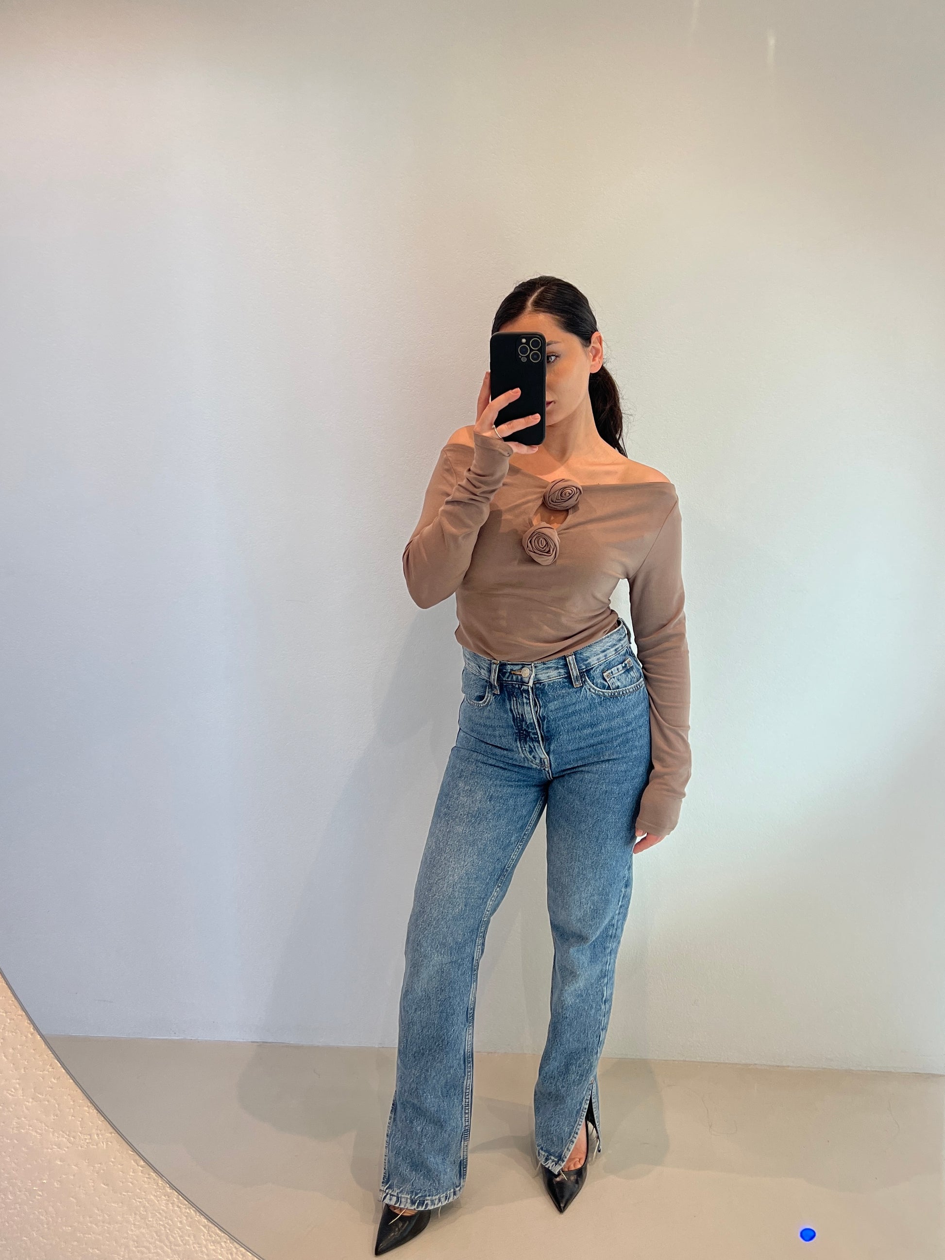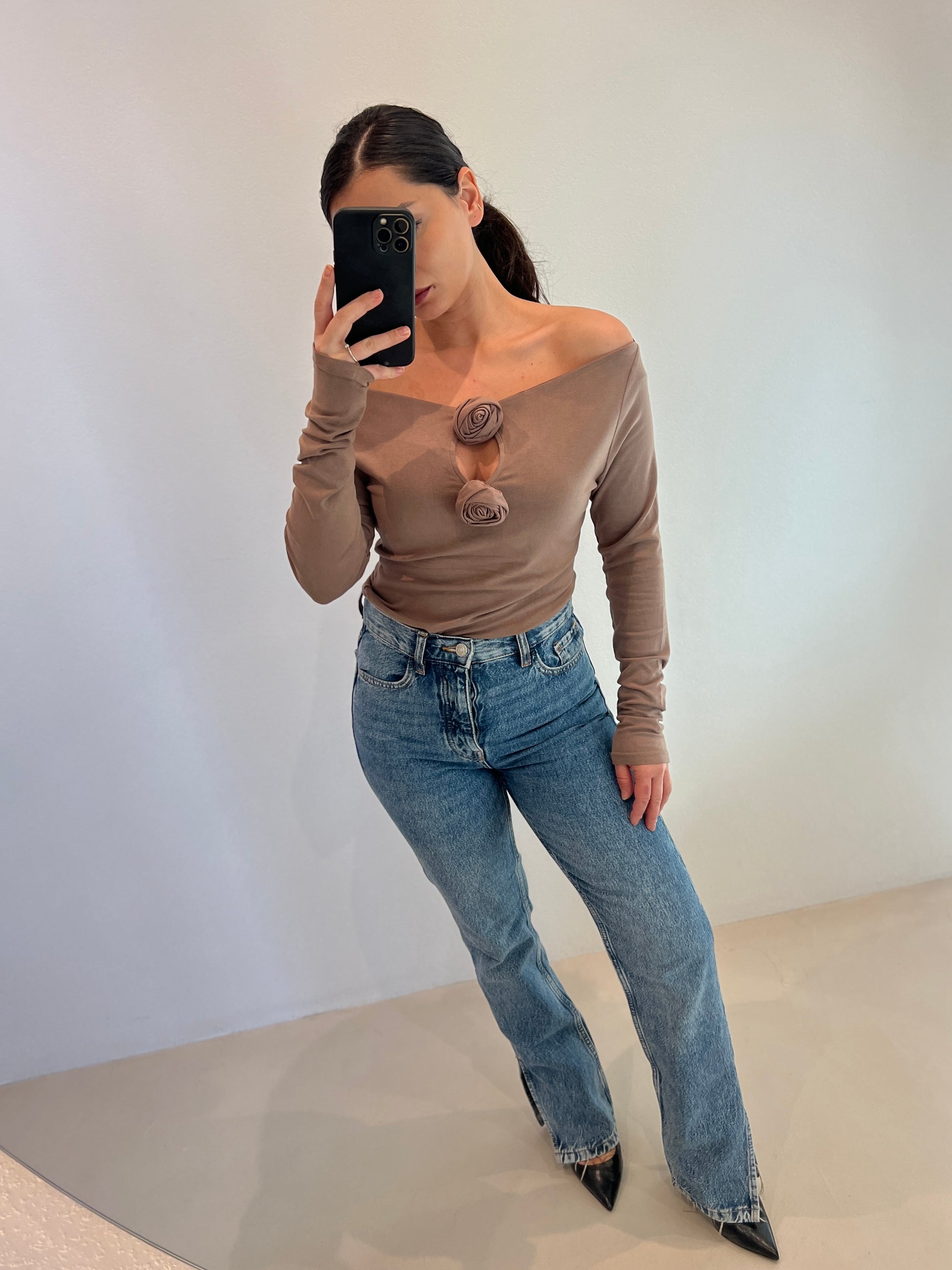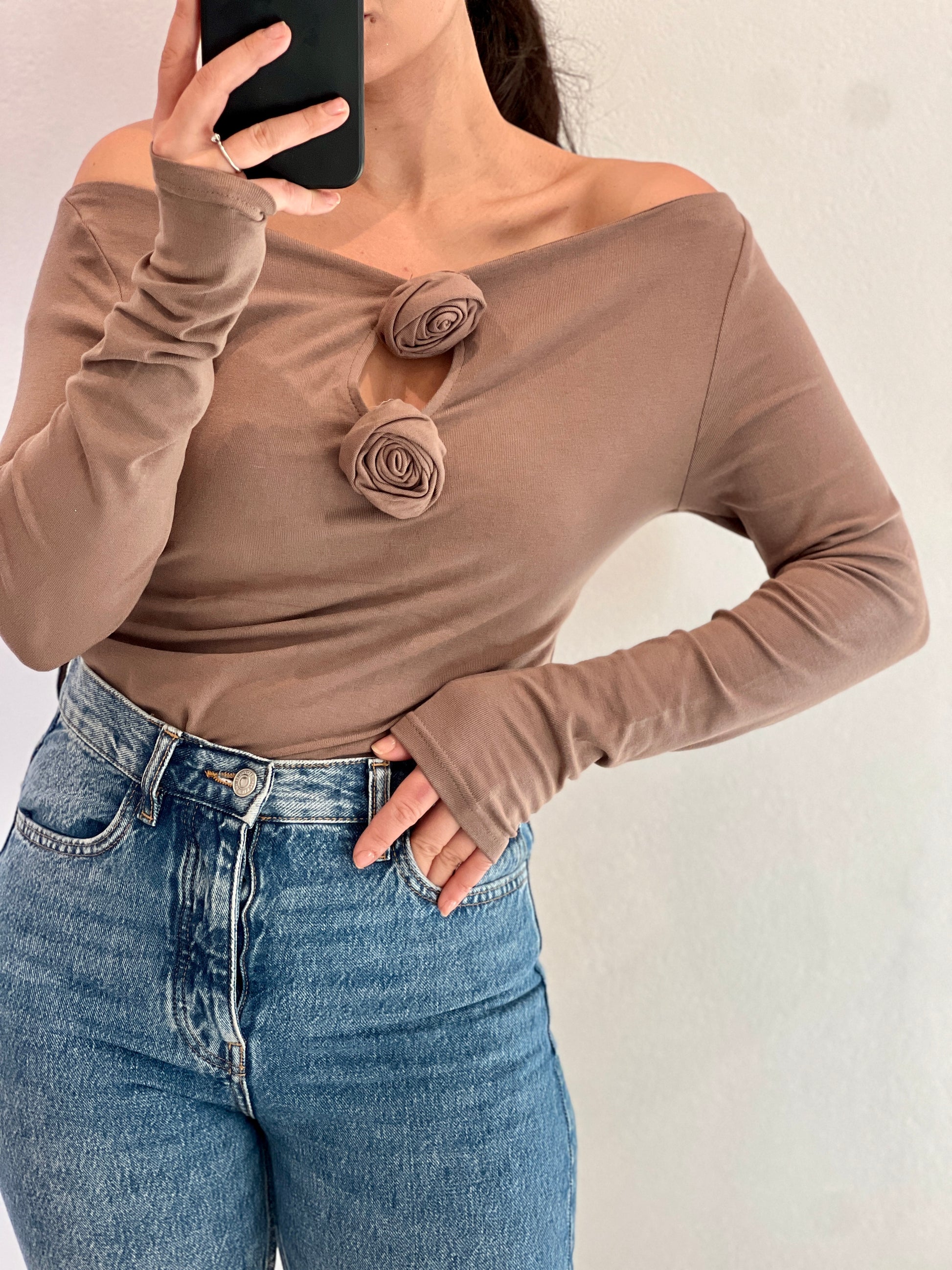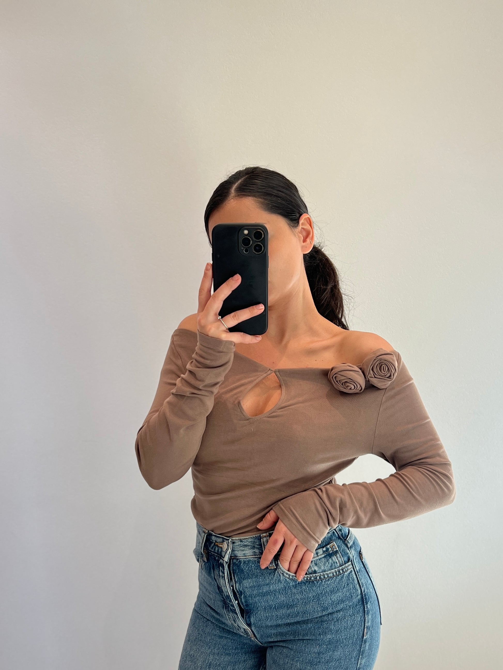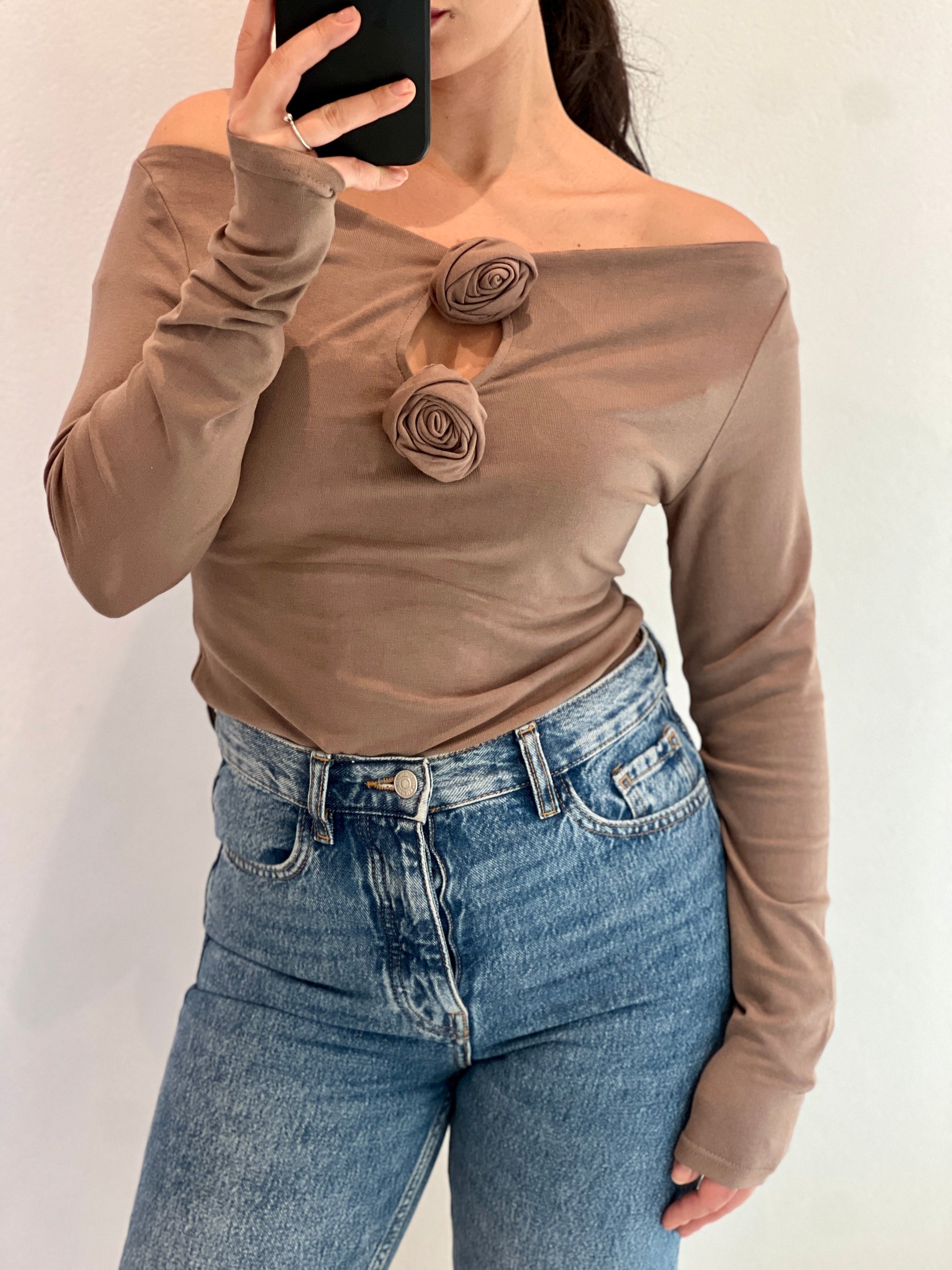Блуза с паднало рамо в цвят капучино с декоративни рози-брошки