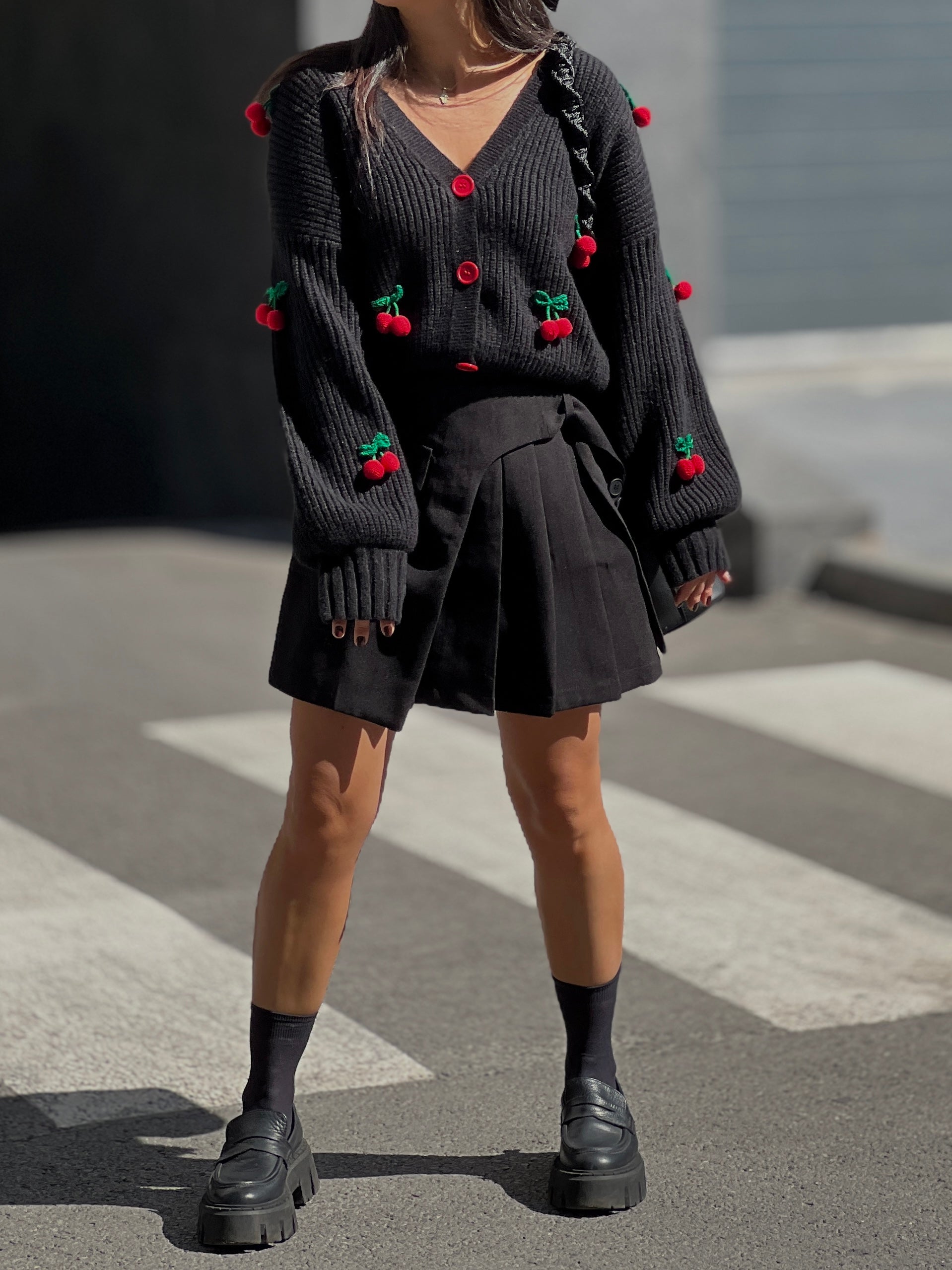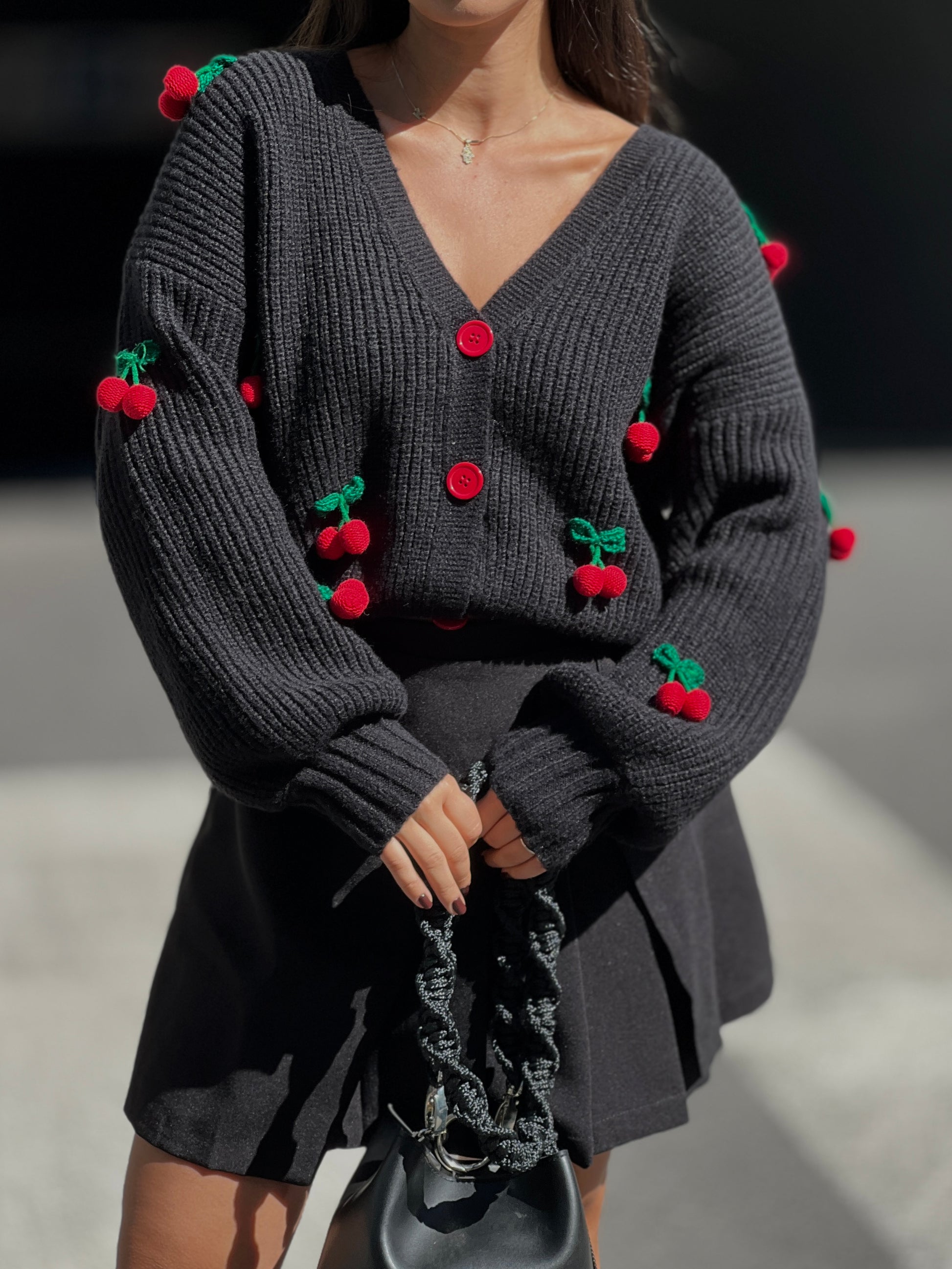 Закачлива и ултра мека жилетка с ръчно плетени черешки. Съчетай с бяла риза за страхотна есенна визия!