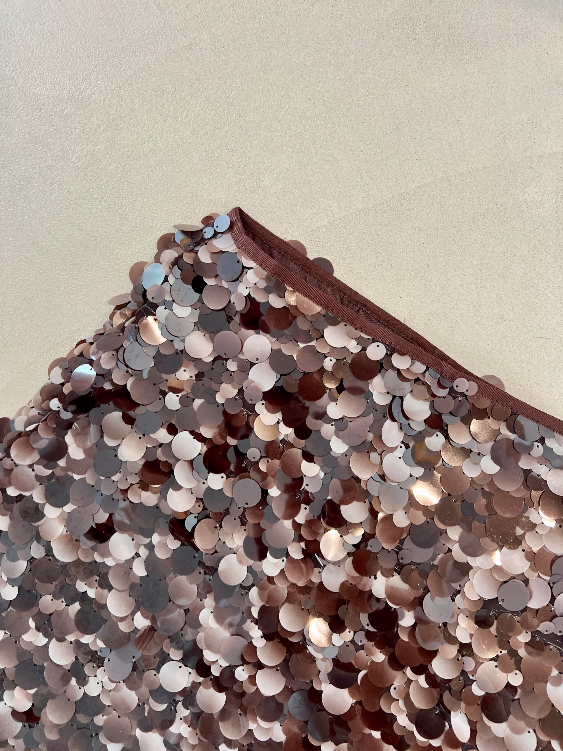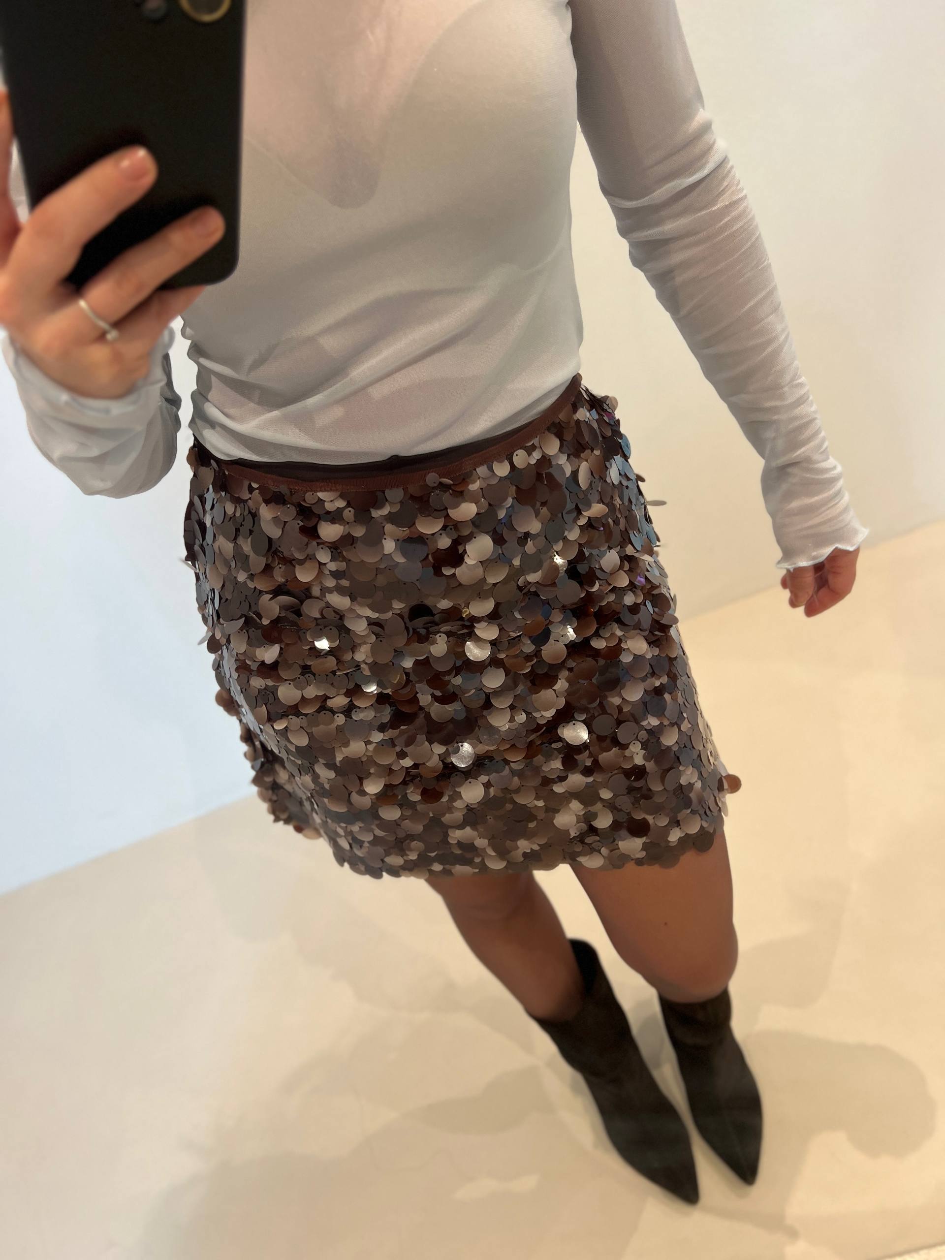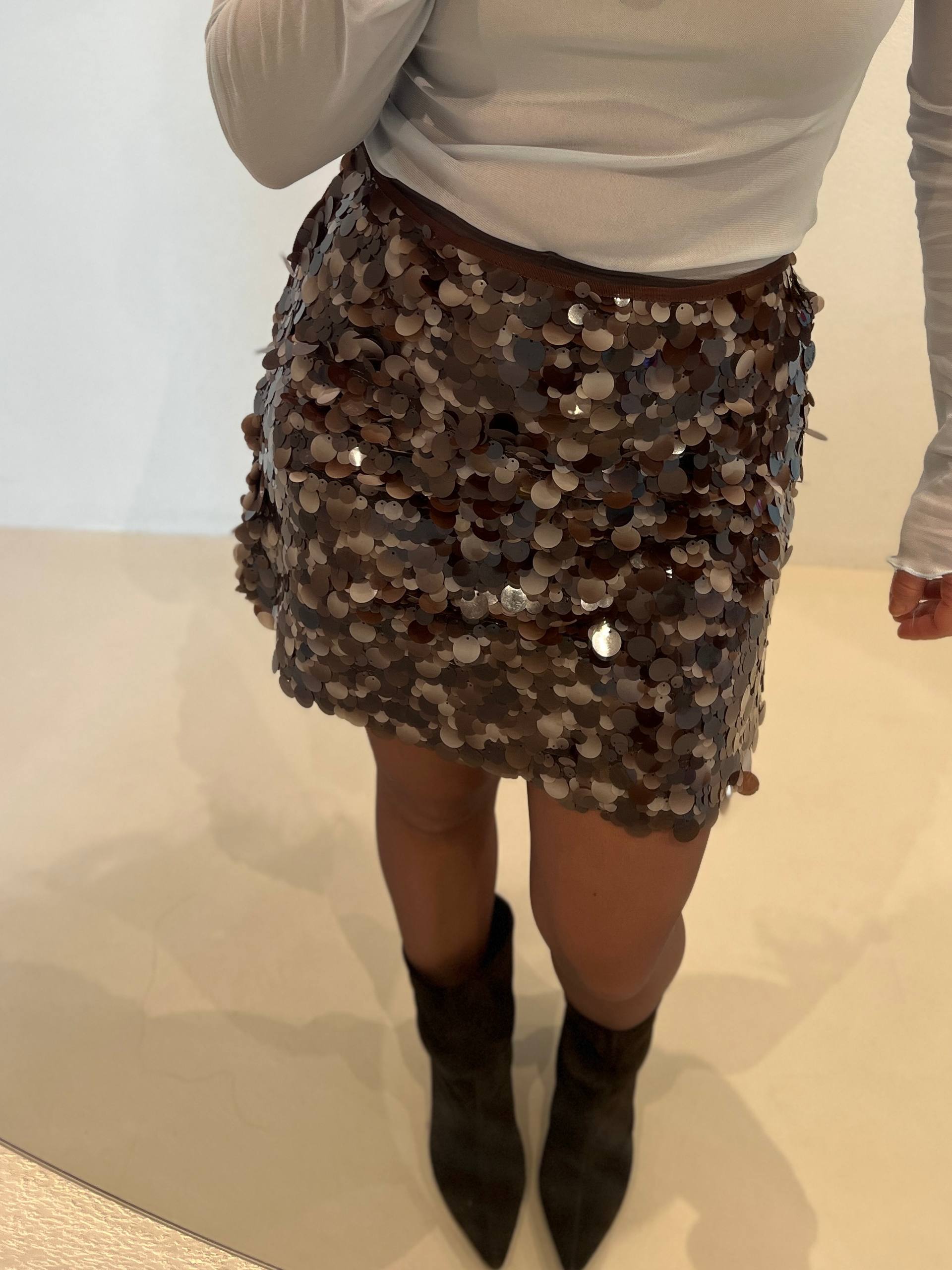 Must-have за всяка модна дива! Тази пола ще ти създава настроение през цялата година! Пайетите са в различни размери и нюанси на така любимото кафяво. Добави в гардероба си това наистина стило попълнение.