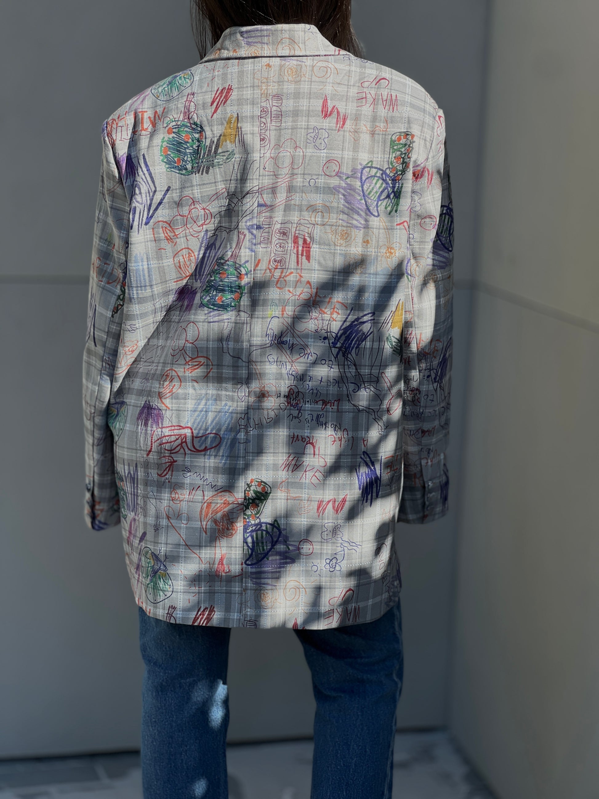Сакото е с права, класическа овърсайз кройка, хастар и две копчета. Декоративни копчета на ръкавите.