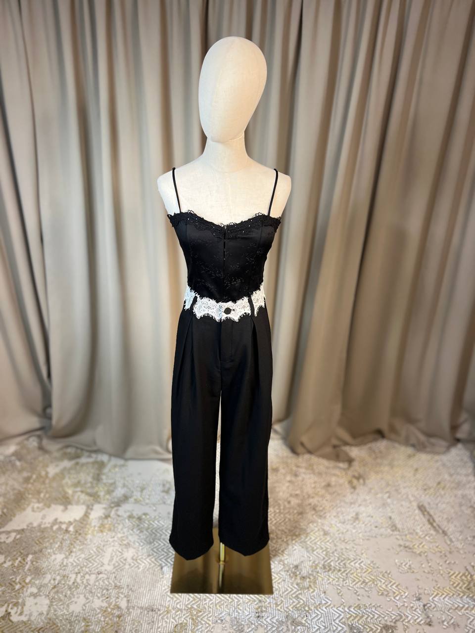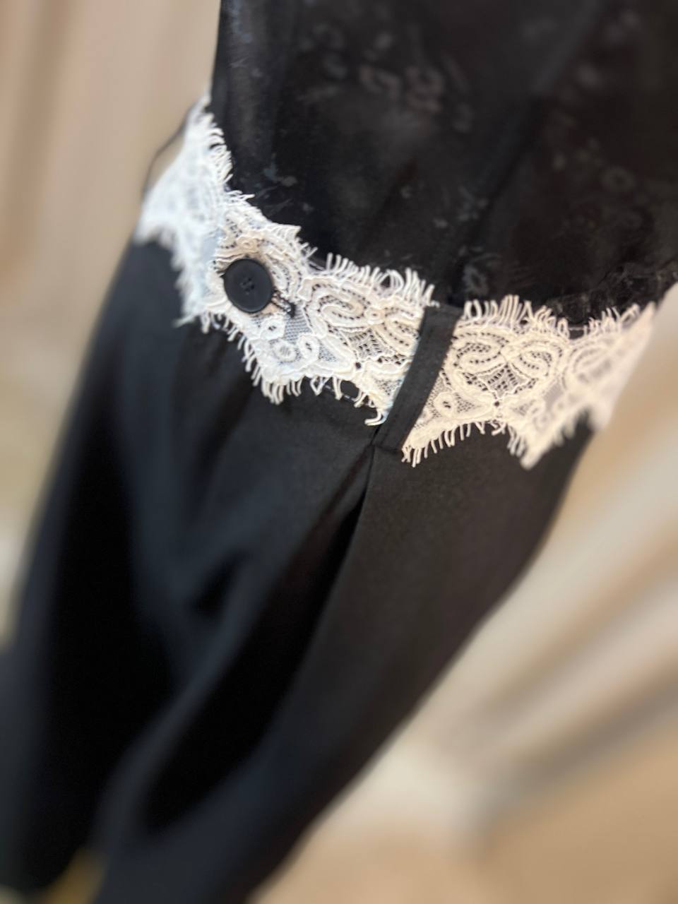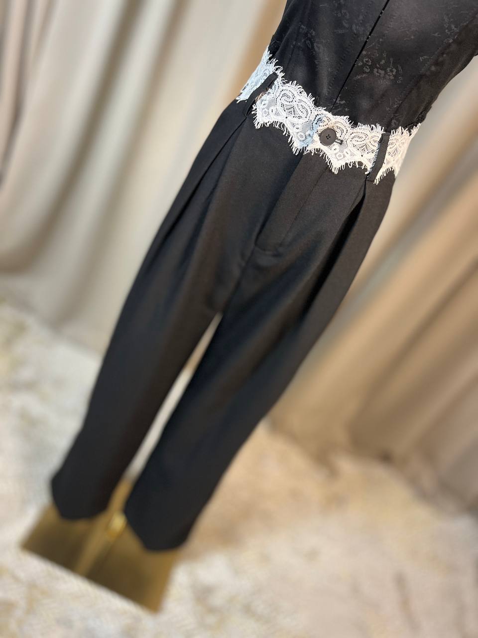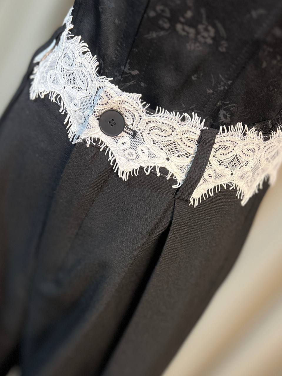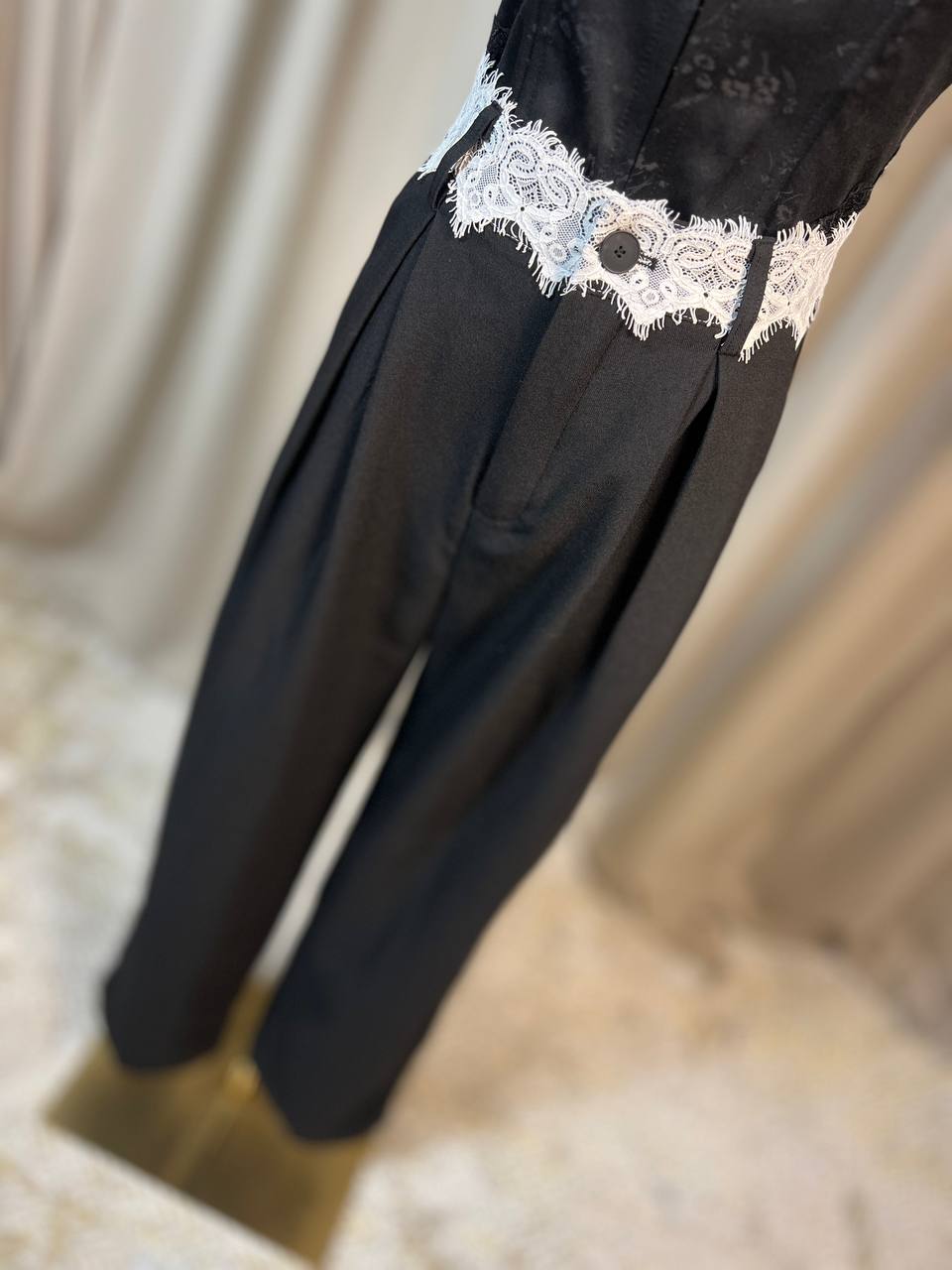 Класически черен панталон с красив детайл от бяла дантела на талията