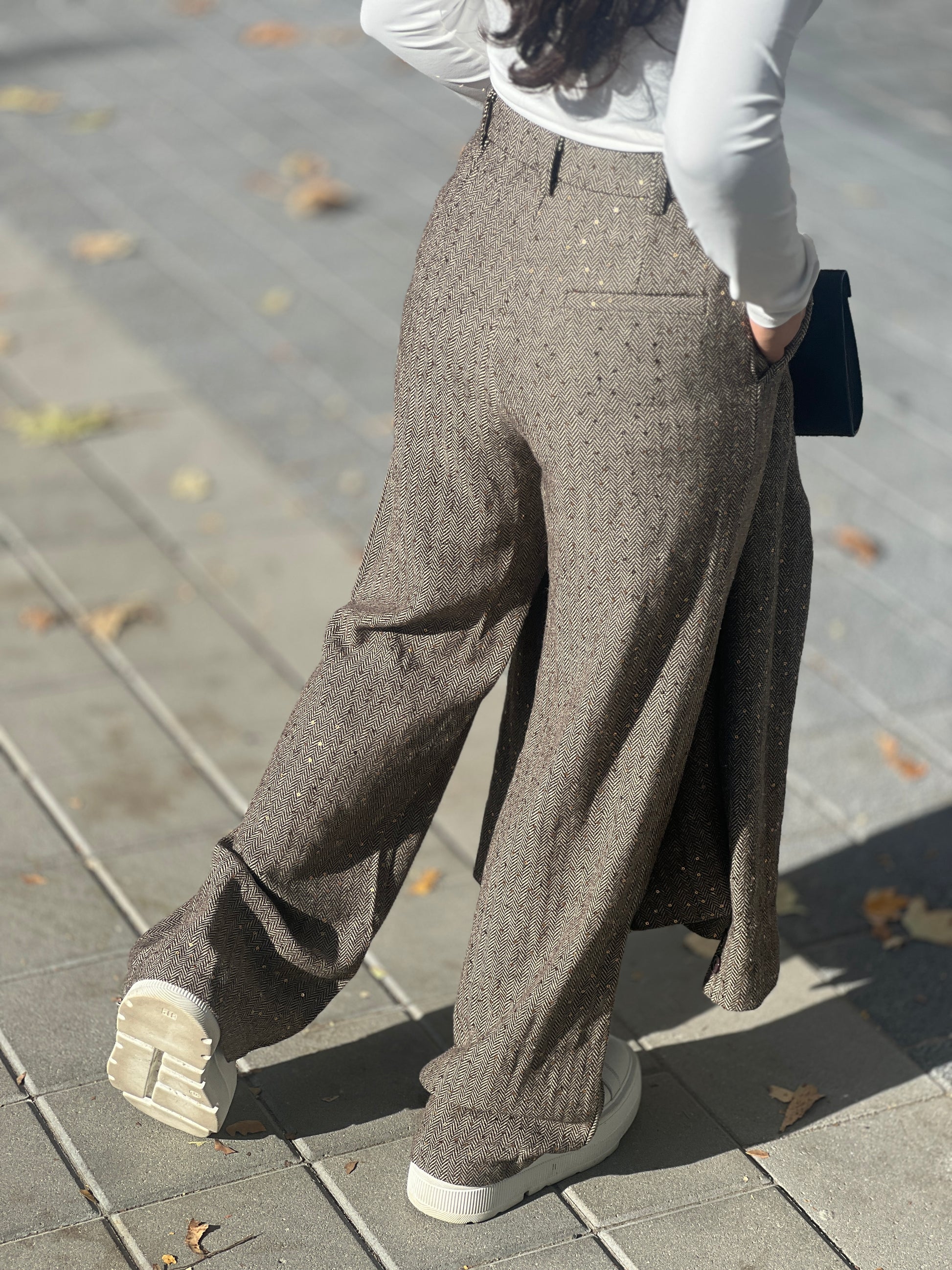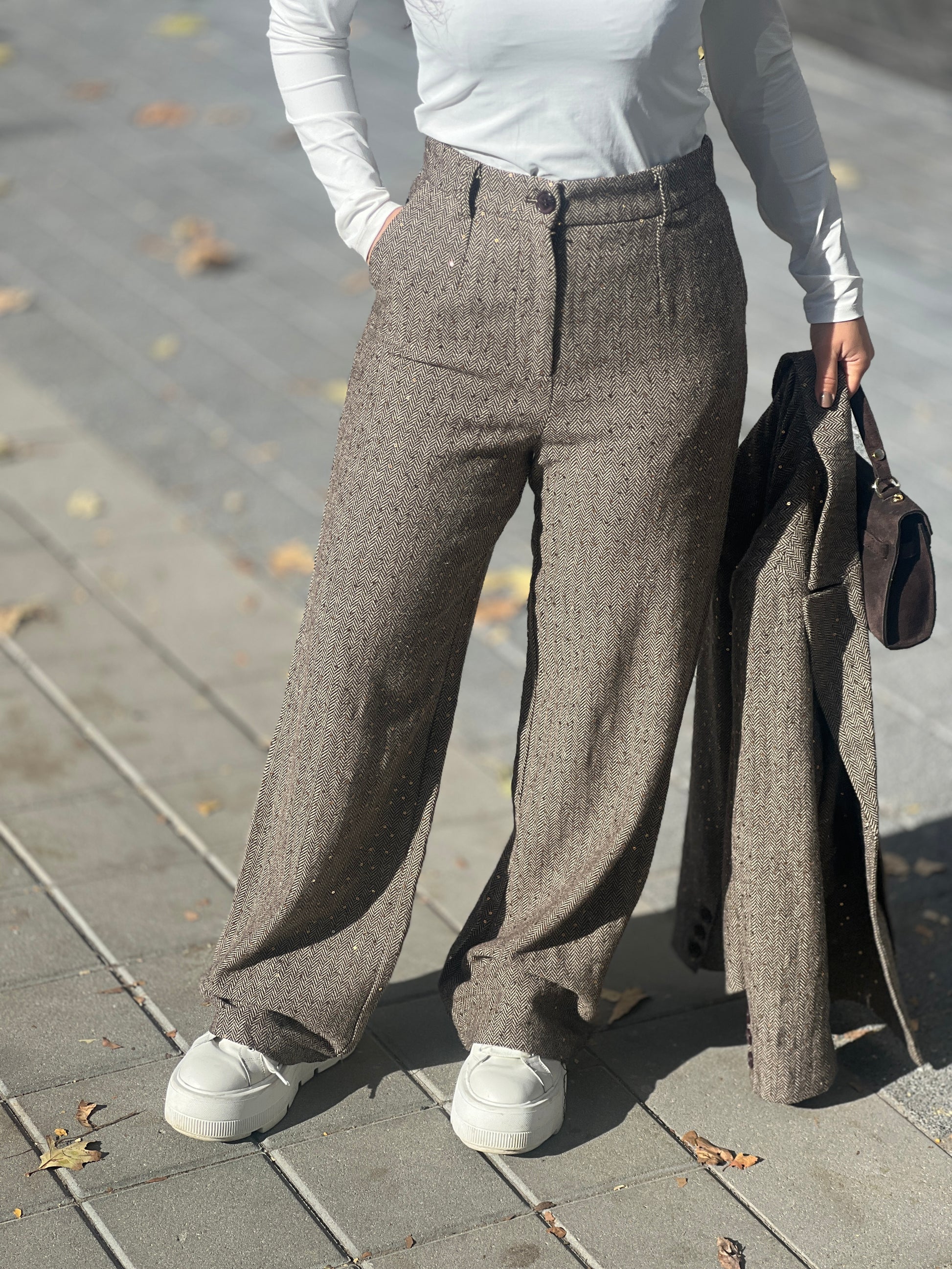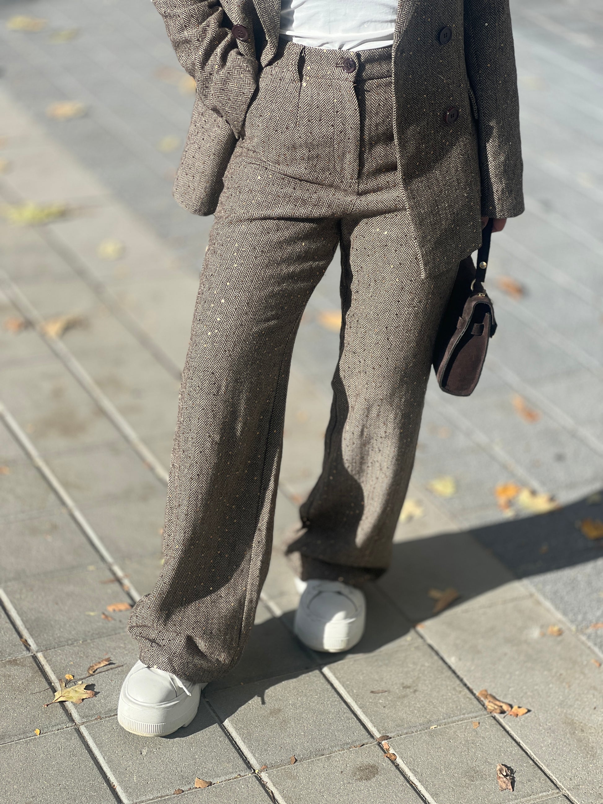 Дреха, която ще остане за много години в гардероба ти. Страхотен панталон в класически десен с фини малки пайети. За случаите, в които искаш да се чувстваш extra special ;) Съчетай със сако GLAM BROWN и създай една незабравима визия!