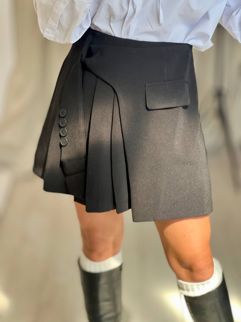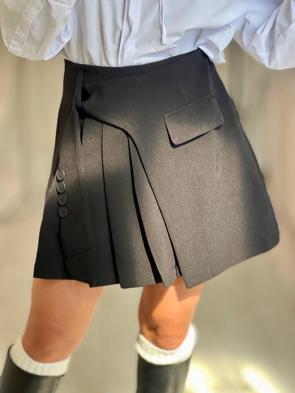 Тренди плисирана пола с нестандартна кройка и детайл с копчета