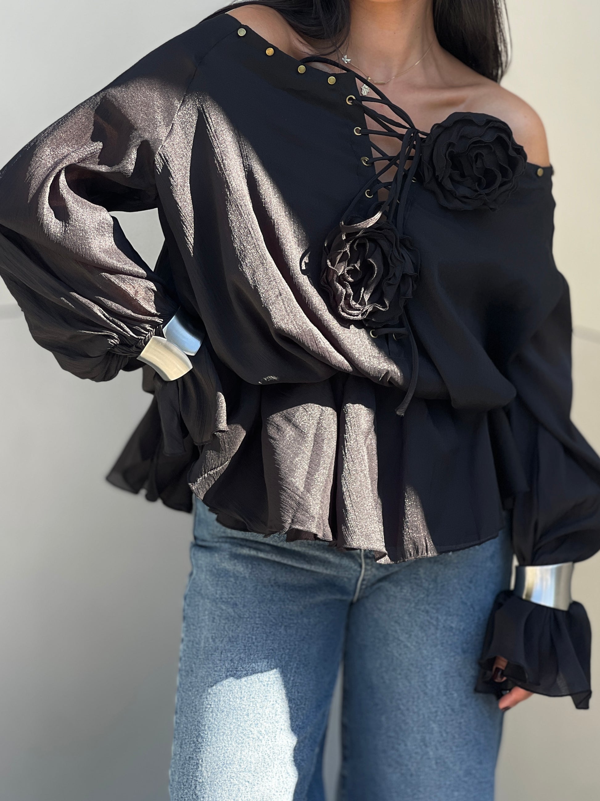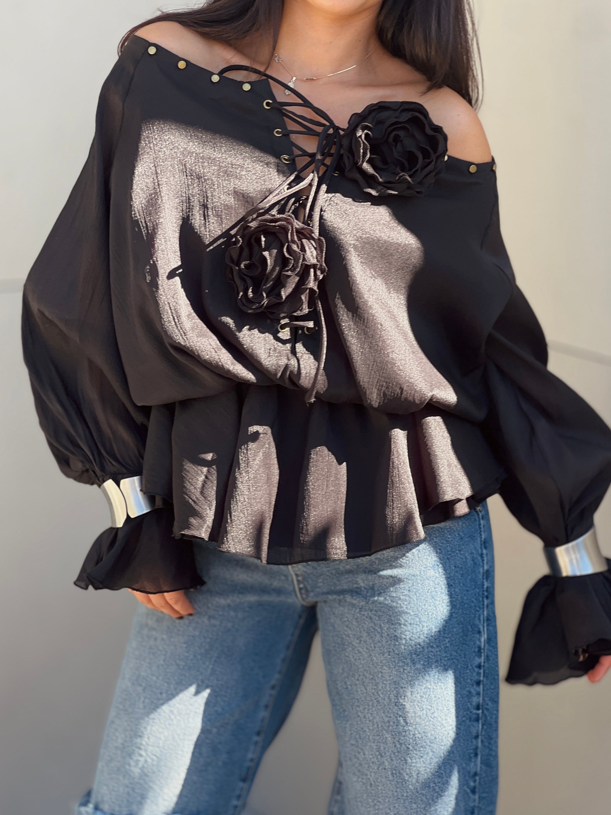 Свободна кройка, с паднало рамо, връзки и ластик при талията и ръкавите