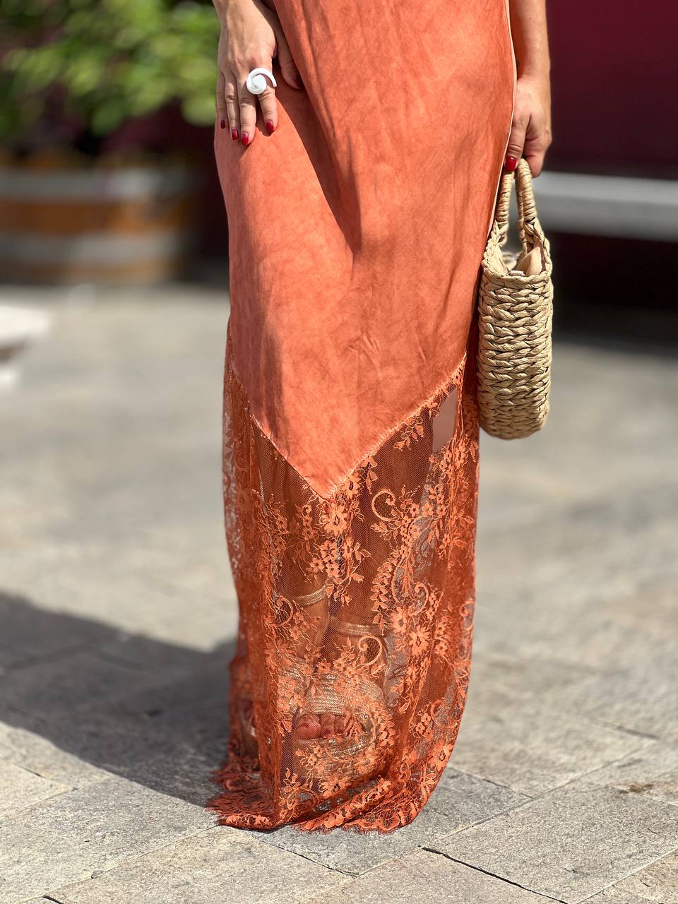 Изключително нежна и красива, от фин сатен и деликатна дантела... перфектната рокля за морето! Влюбени сме!
